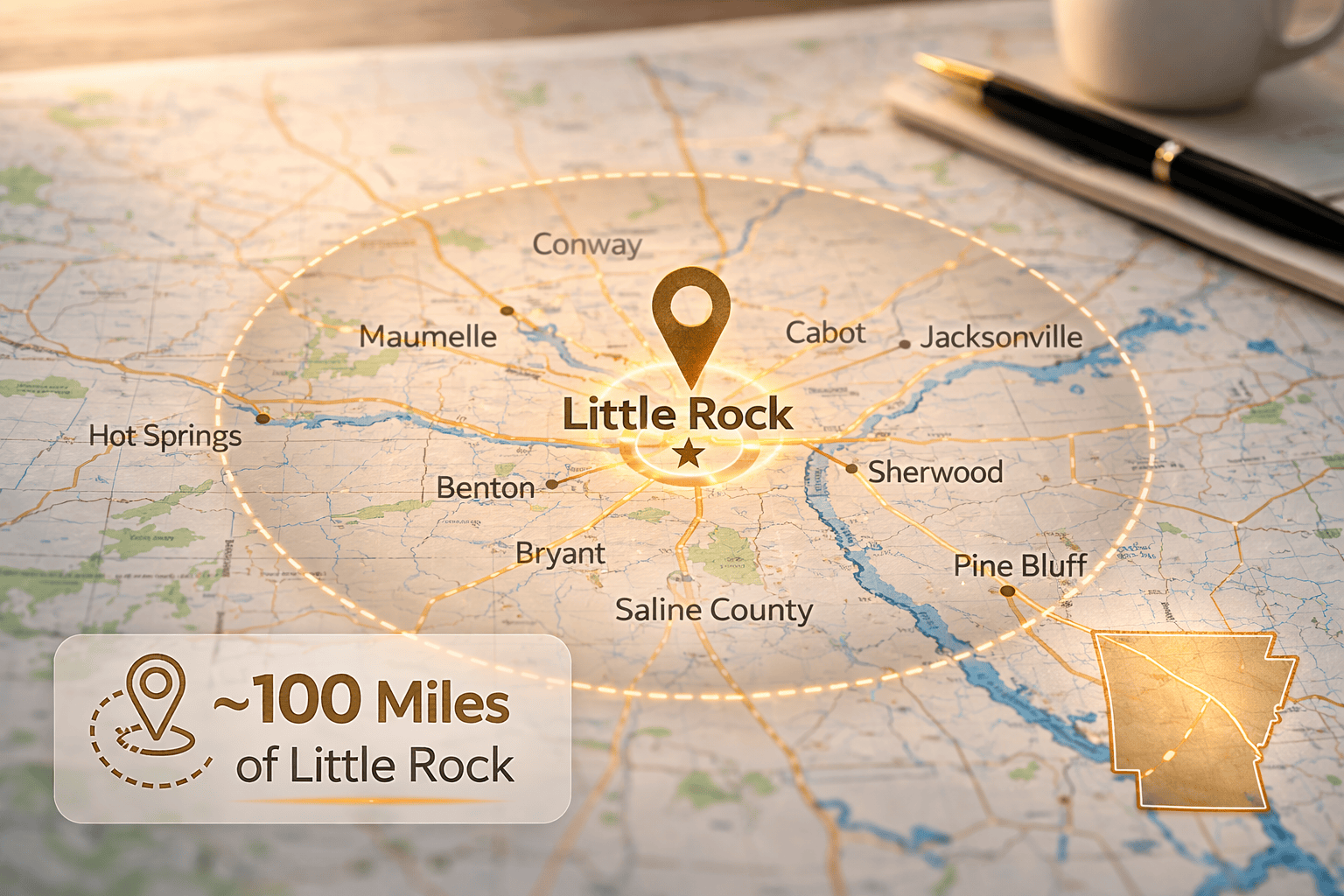We serve clients within approximately 100 miles of Little Rock (Pulaski County). Availability depends on staffing and scheduling.